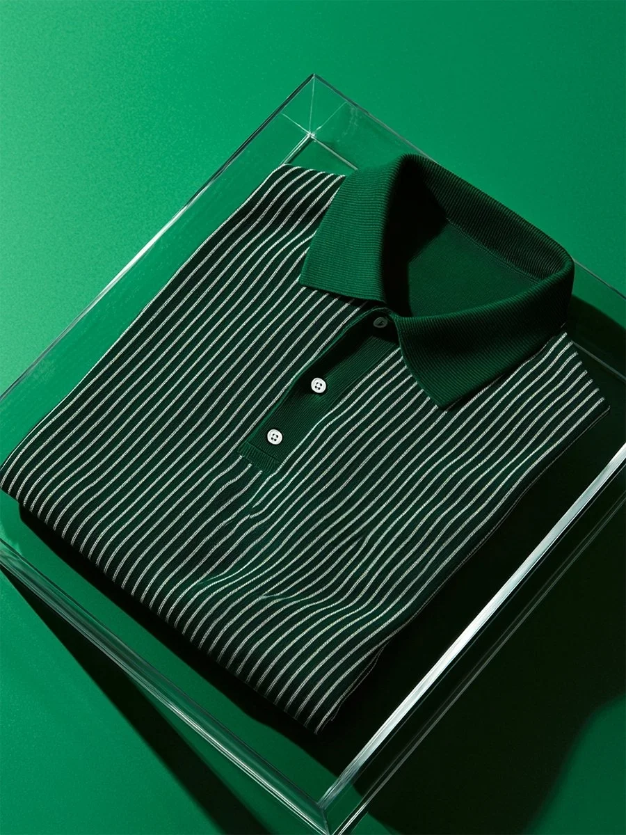 This men's polo shirt is made from high-quality polyester material. It features a striped pattern and a button-down collar. The short sleeves provide comfort and flexibility. The elastic fabric ensures a comfortable fit. Suitable for business casual, daily wear, and sports.